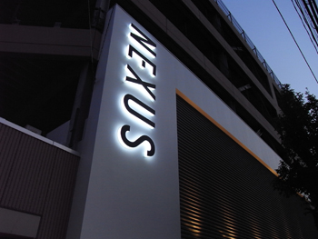 内照式壁面サインは側面発光とし、夜間は文字が浮かび上がった印象となります。モデルルームの特性上短期間の展示であるため、壁面サインの光源にはイニシャルコストをひくく抑えられるネオンを採用しました。